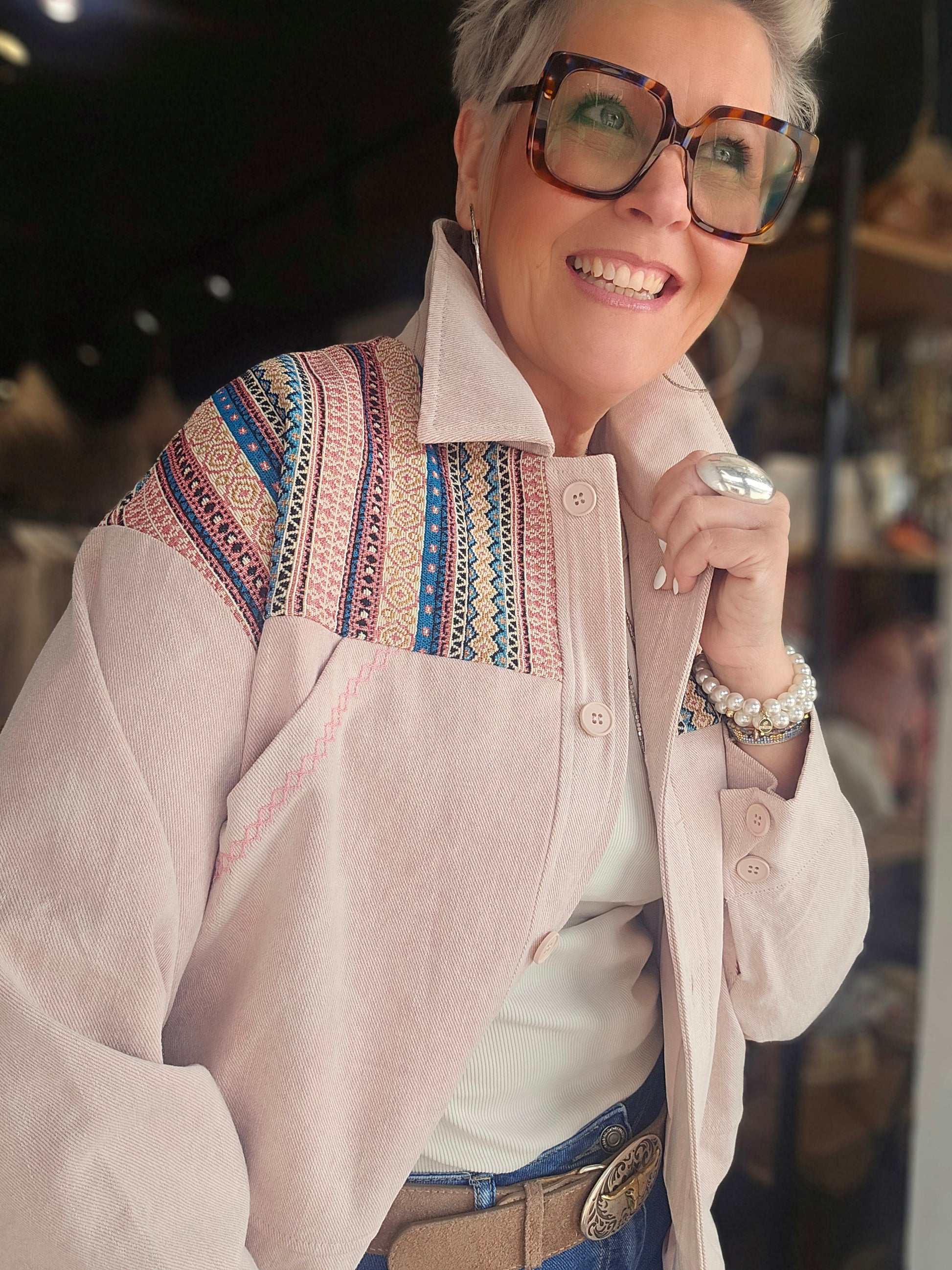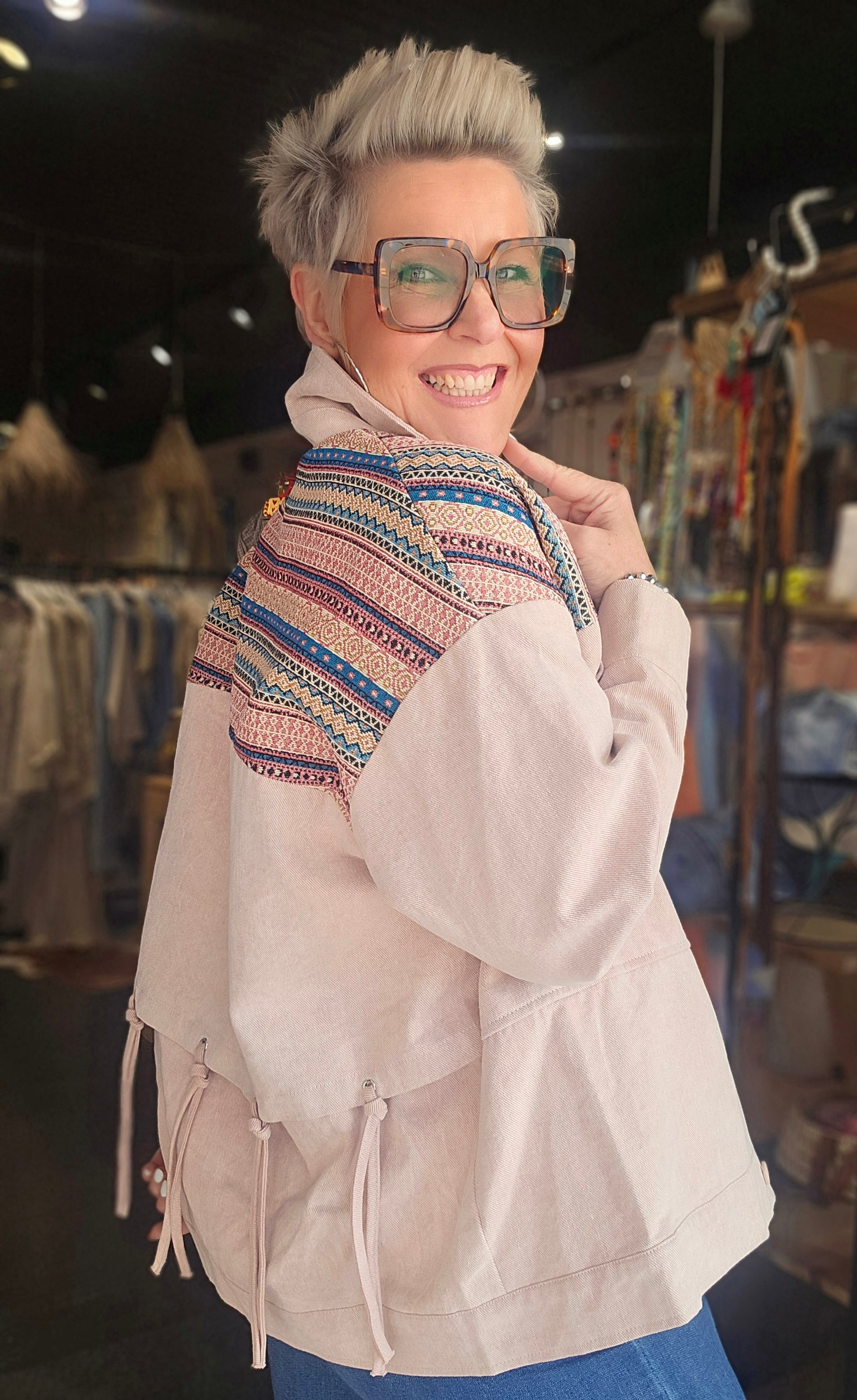 Découvrez une veste à l’allure raffinée, pensée pour sublimer une silhouette avec distinction. Sa conception met en valeur un jeu de matières et de détails subtils, pour une allure bohème chic affirmée.